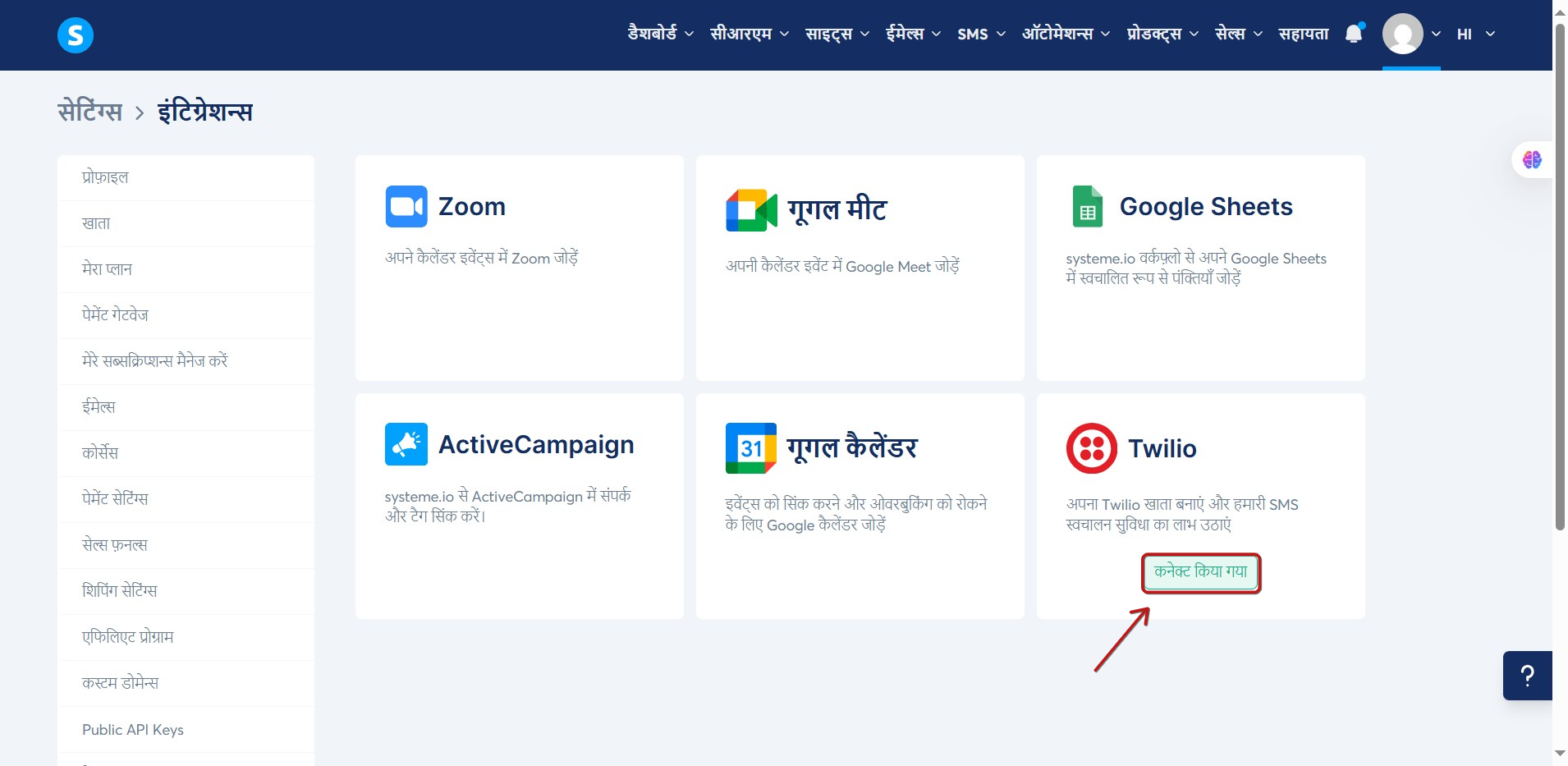 एक बार कनेक्ट होने के बाद, आपका Twilio खाता आपके systeme.io इंटरफ़ेस में दिखाई देगा।