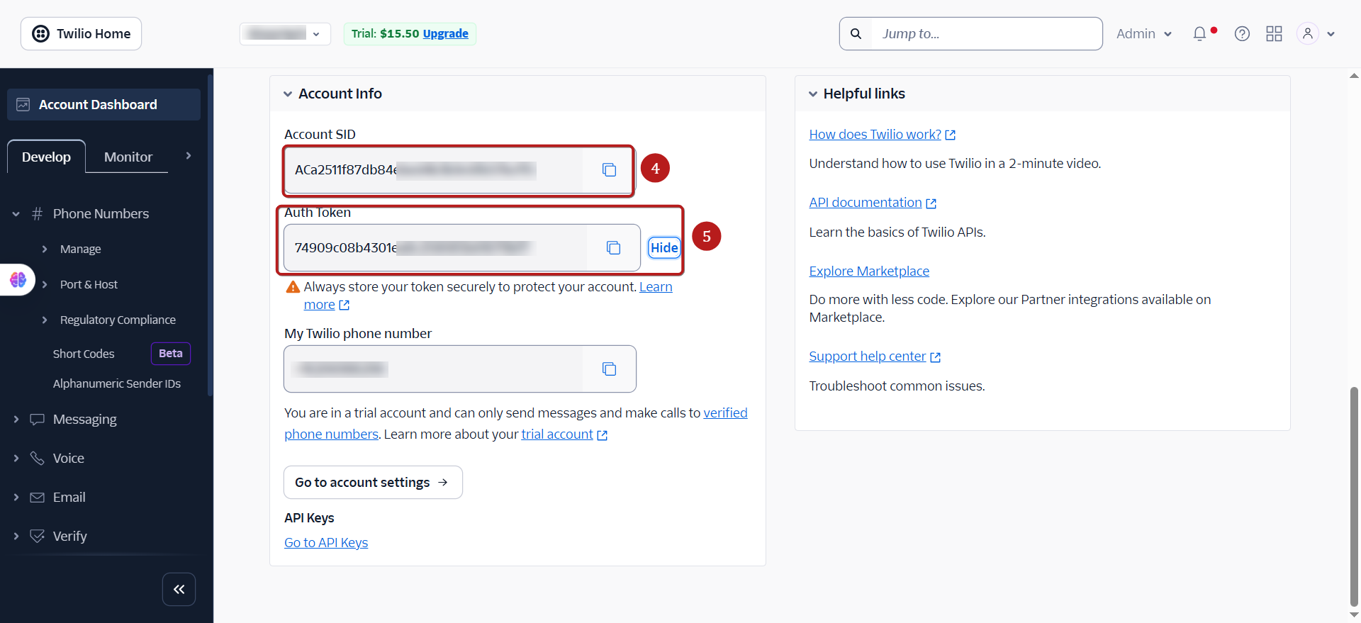 - ट्विलियो SID (4): एक विशिष्ट पहचानकर्ता जो आपके ट्विलियो खाते की पहचान करता है